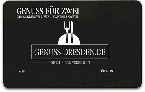 Die personalisierte Genusskarte im Scheckkartenformat berechtigt Sie, in allen Restaurants der Genuss-Dresden Gastronomie Gruppe zwei Hauptspeisen zum Preis von einer zu bekommen.